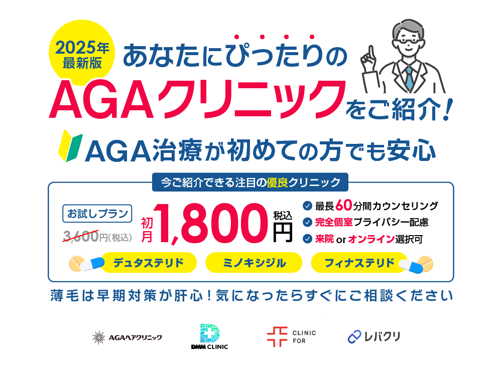 AGAヘアクリニックは、医師・毛髪診断士・カウンセラーの専門チーム制によるきめ細やかなサポートが大きな強みです。初診から治療継続まで丁寧に寄り添い、副作用フォローや不安相談にも即時対応できる体制は他院と一線を画します。完全個室や匿名相談などプライバシー配慮もトップレベルで、初めてのAGA治療でも安心して任せられる総合力の高いクリニックと言えます。